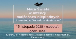 Drodzy, zapraszamy na listopadowe spotkanie Duszpasterstwa Małżeństw Niepłodnych, które odbędzie się w sobotę 15 listopada w domu s. nazaretanek przy ul. Nazaretańskiej 1 w Krakowie. Rozpoczniemy je tradycyjnie Mszą św. w kaplicy o godz. 16:00. To jest zawsze okazja, aby powierzyć swoje starania, problemy i nadzieje Dobremu Panu Bogu.