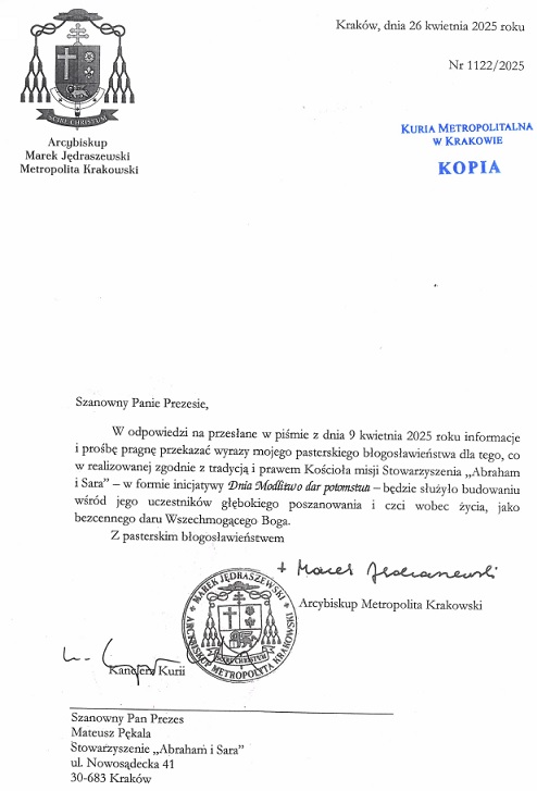 Z góry dziękujemy wszystkim, którzy zechcą włączyć się do tej inicjatywy modlitewnej. Będziemy także bardzo wdzięczni, jeśli powiecie nam, że u Was w parafii modlitwa o dar potomstwa się odbyła – prosimy o informację w komentarzu lub emailem na adres stowarzyszenie@abrahamisara.pl